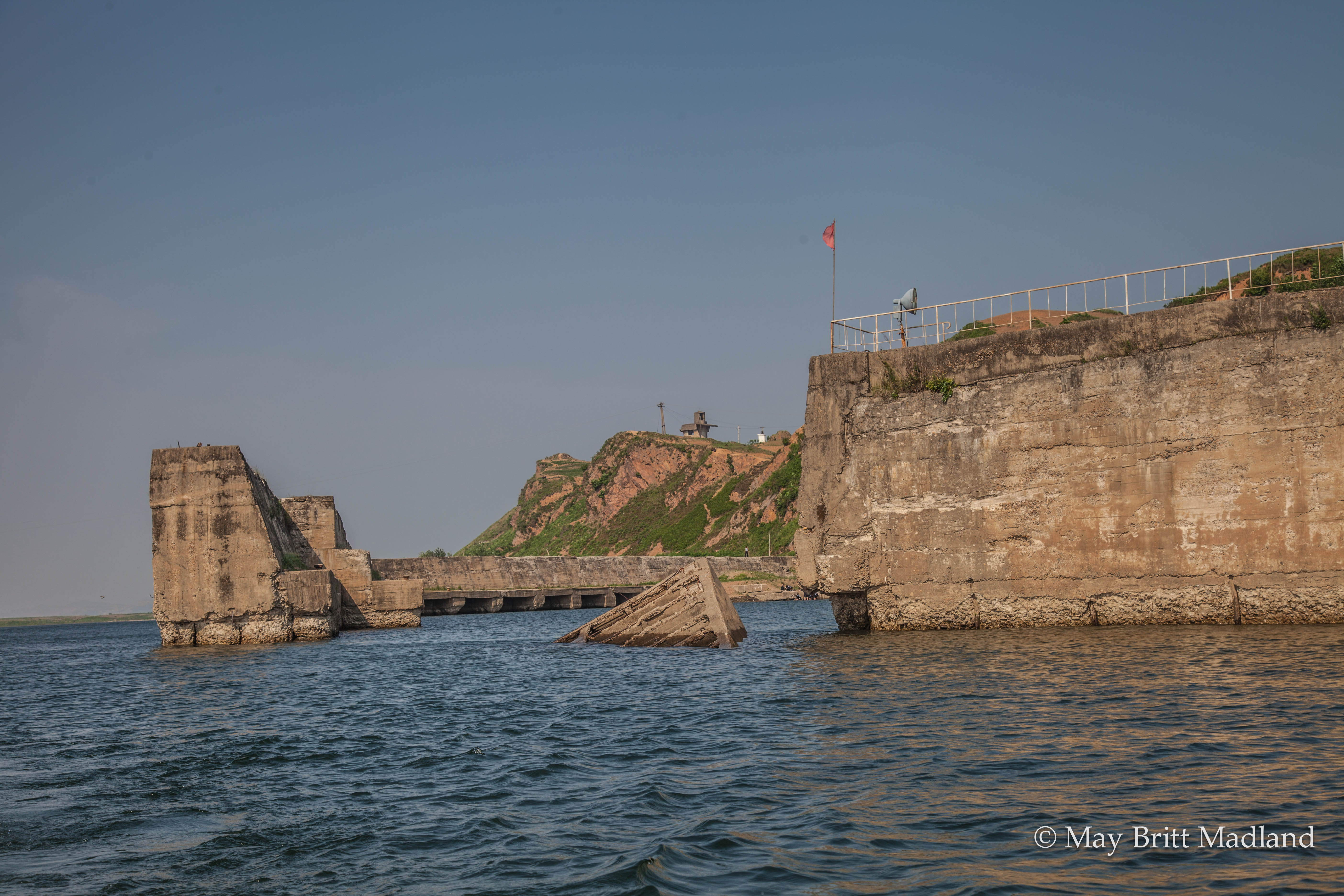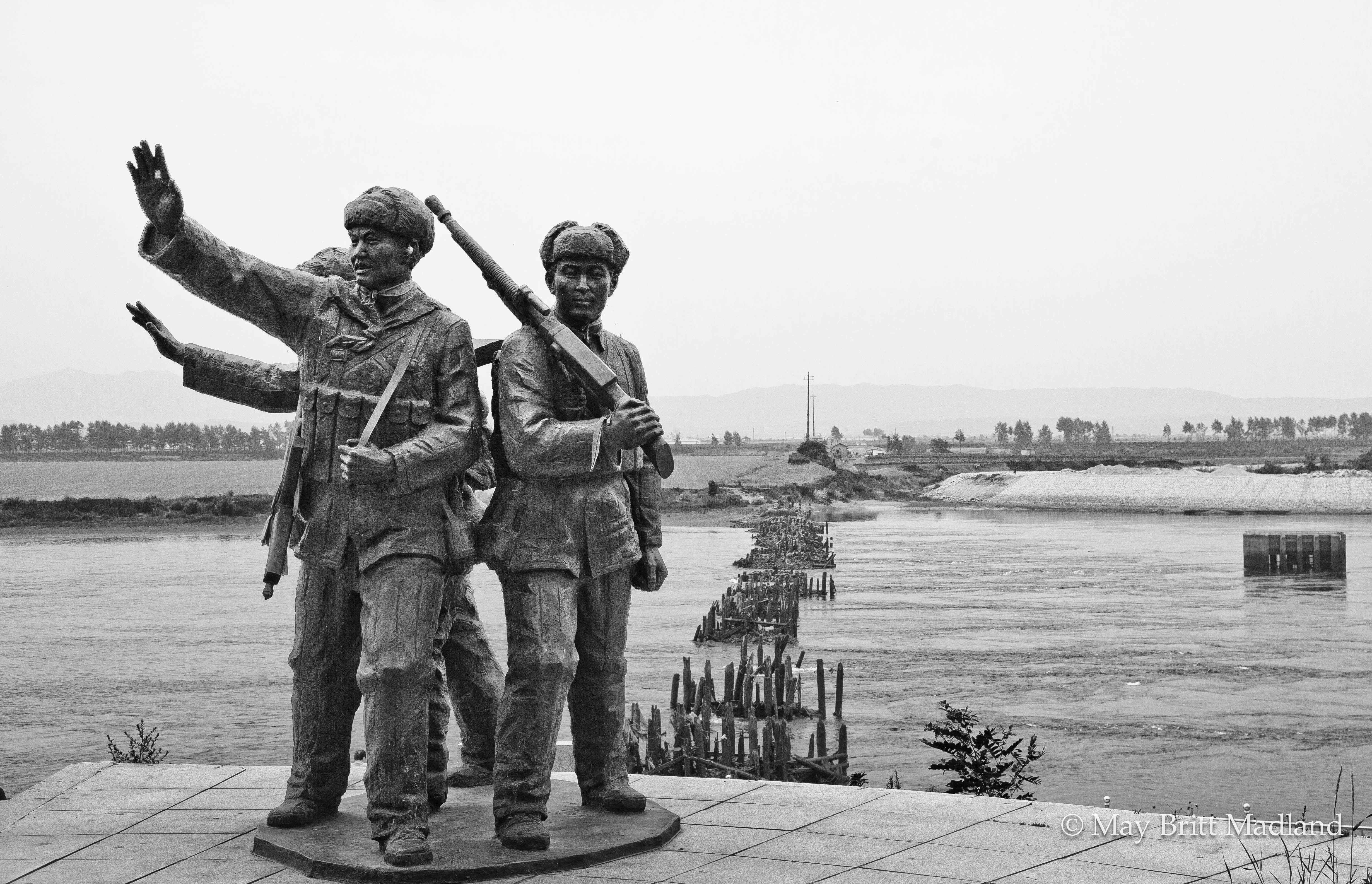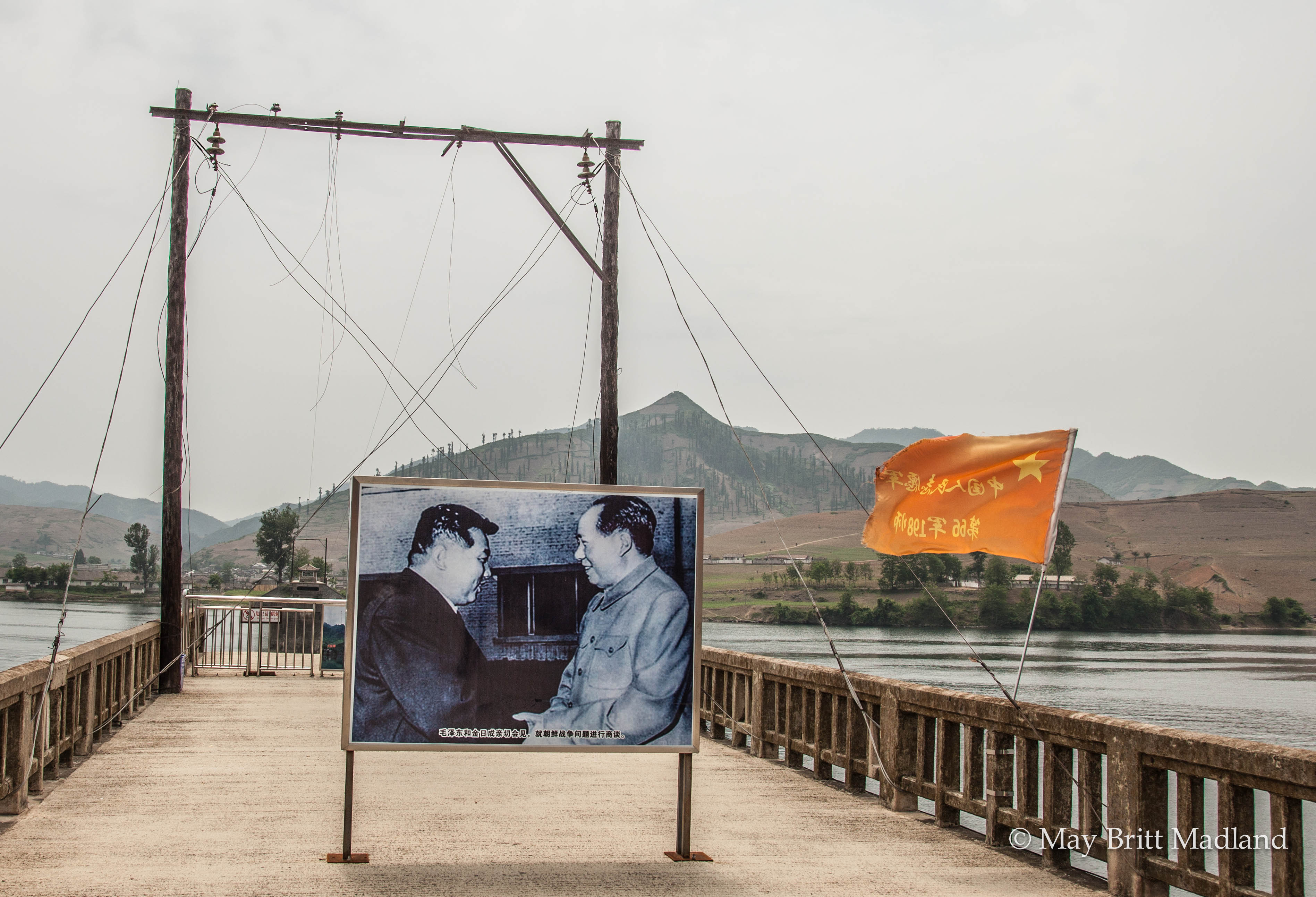 Arriving at the end of the bridge I passed a picture of former Chinese leader Mao Zedong (R), and North Korean late leader Kim Il Sung. I passed the poster and hit a dead end. A metal fence stopped me from getting any further. It was the end of a bridge that before had been a connection between China and North Korea.