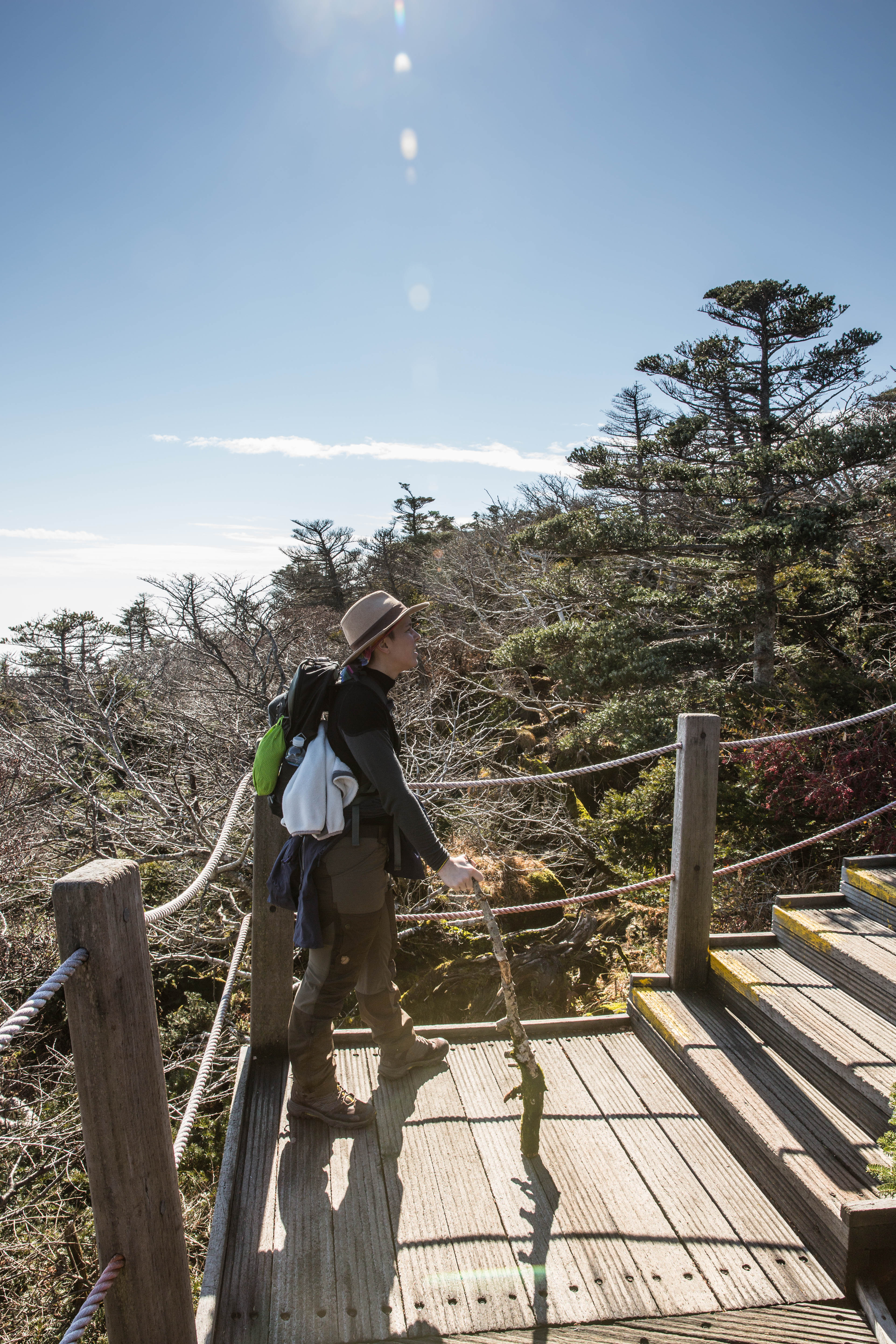 After a short rest at Jindallaebat shelter we continued uphill were we changed from walking in terrain of thick forest to enter out to more open landscape as we were getting above the tree limit. At this point we could see the summit at a distance. It looked so close but with a steep uphill it was the hardest part of the trek. The trail changed from slippery rocks to man made wooden stairs with a quite crowded trail at this point. Some going up and some coming down.